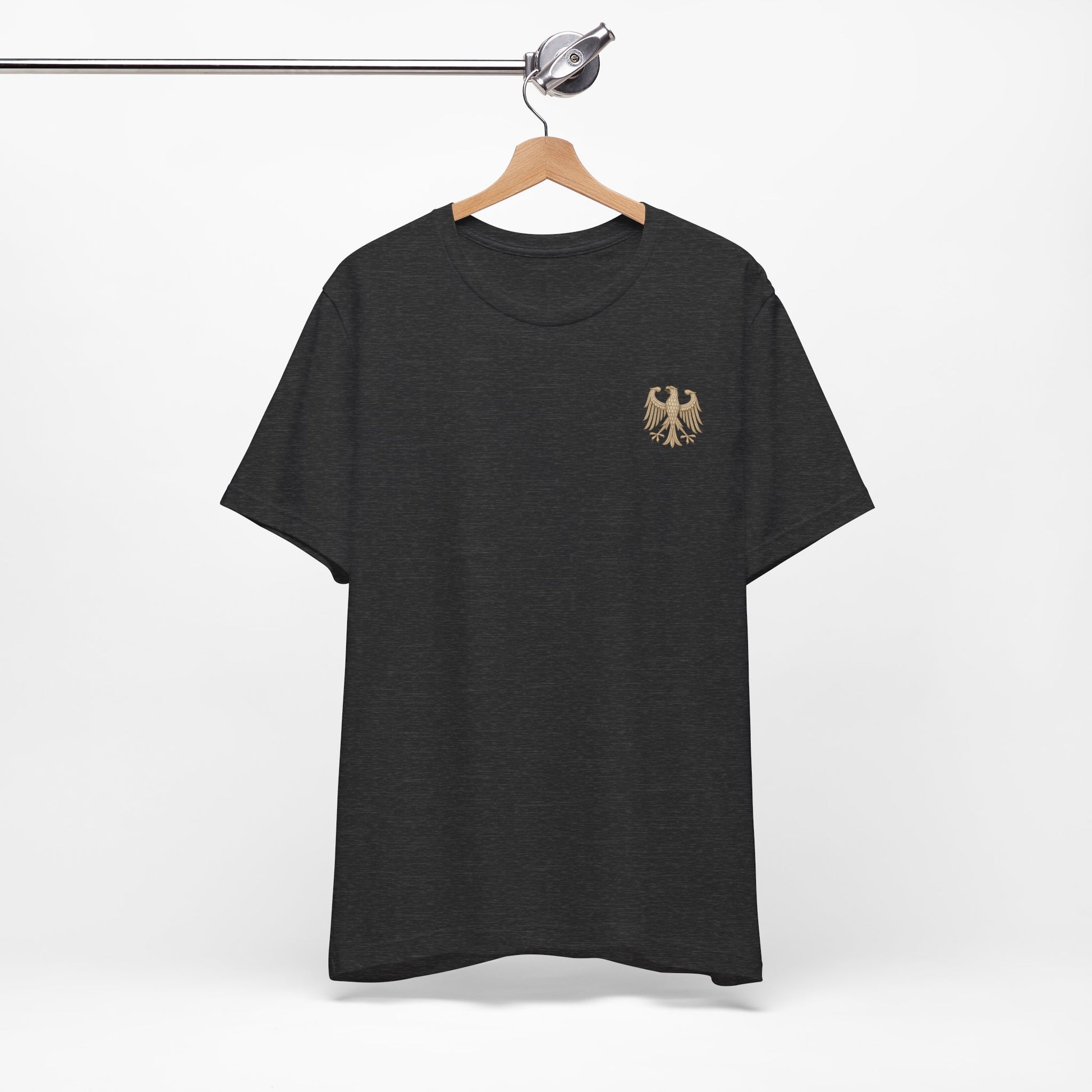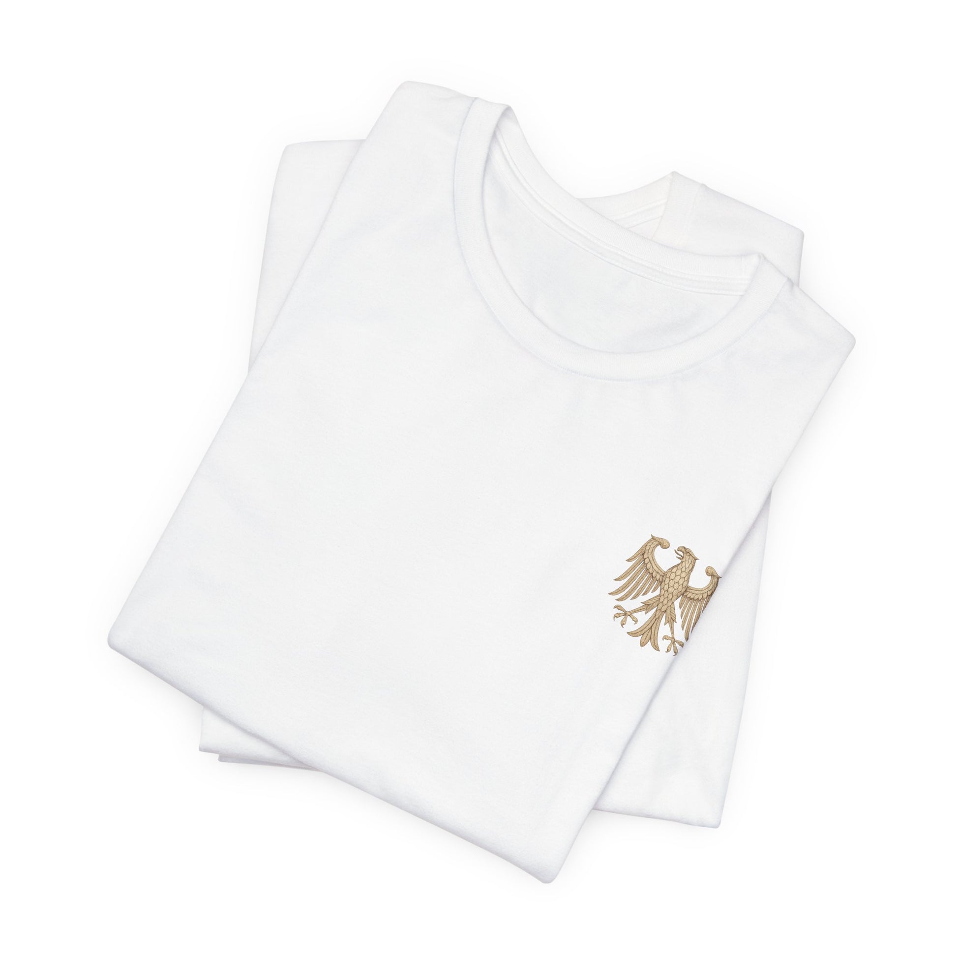 This piece features a small Federal-style eagle on the front chest and a bold quote across the upper back reading: